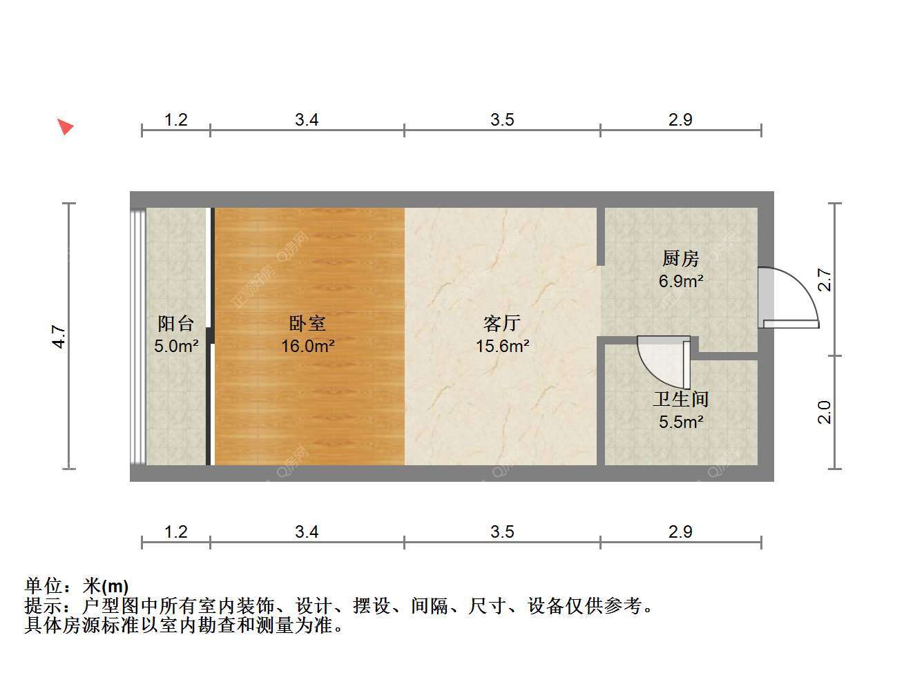 【户型介绍】1房1厅1卫!北朝向! 带阳台