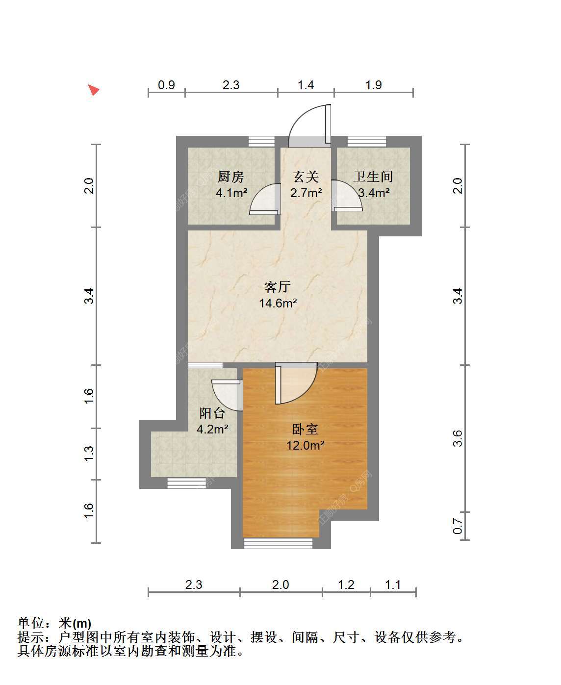 3、面积:1房1厅1卫1阳